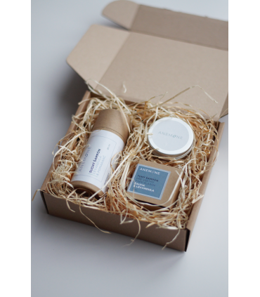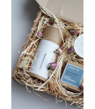 V balíčku nájdete tuhý šampón s bylinkovo-drevitou vôňou levandule, šalvie a cédrového dreva a taktiež praktickú cestovnú nádobku, v ktorej môžete tento šampón uchovávať. Sadu dopĺňa suchý šampón vo forme púdru, ktorý je určený na príležitostné rýchle zmatnenie a osvieženie mastných vlasov.